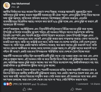 দেশের বিশেষজ্ঞ, শ্রমিক এবং ব্যবসায়ীদের প্রবল বিরোধিতা সত্ত্বেও কেন এসব চুক্তি করা হচ্ছে, তার কঠোর সমালোচনা করে তিনি তিনটি প্রধান দিক তুলে ধরেন। প্রথমত, এসব চুক্তি করা হচ্ছে সম্পূর্ণ অস্বচ্ছতা ও নিয়মবহির্ভূতভাবে। দ্বিতীয়ত, যেখানে অন্তর্বর্তী সরকারের দায়িত্ব ছিল বিগত আমলের জনস্বার্থবিরোধী চুক্তিগুলো থেকে বের হওয়ার পথ খোঁজা, সেখানে তারা উল্টো নতুন নতুন চুক্তির বোঝা চাপাচ্ছে। তৃতীয়ত, এর ফলে বাংলাদেশ দীর্ঘমেয়াদী অর্থনৈতিক পরাধীনতা ও ভূ-রাজনৈতিক ঝুঁকির আবর্তে নিক্ষিপ্ত হচ্ছে।