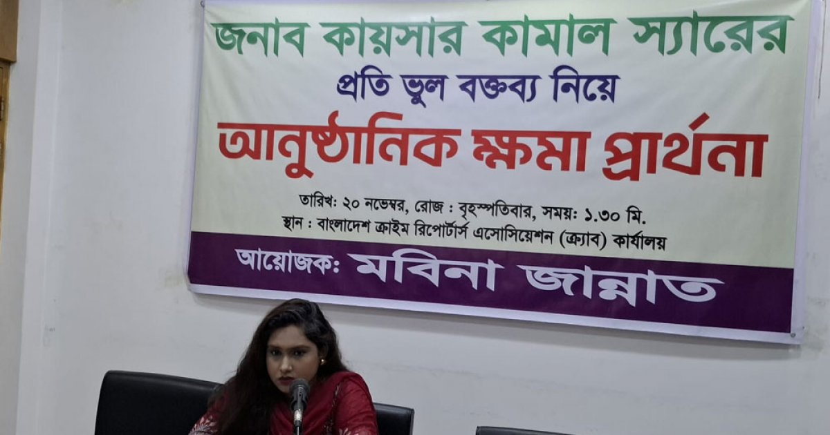 বৃহস্পতিবার (২০ নভেম্বর) দুপুরে বাংলাদেশ ক্রাইম রিপোর্টাস অ্যাসোসিয়েশনে (ক্র্যাব) এক সংবাদ সম্মেলনে মবিনা জান্নাত নামের ওই নারী বলেন, ‘গভীর অনুতাপ নিয়ে আপনাদের সামনে হাজির হয়েছি। একটি ‘slip of tongue’-এর কারণে একজন সম্মানিত মানুষের প্রতি একটি অন্যায় পরিস্থিতি তৈরি হয়েছে। এ জন্য আমি জনাব কায়সার কামাল স্যারের কাছে প্রকাশ্যে ক্ষমা চাইছি।’