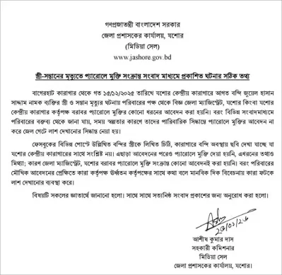 এদিকে যশোর জেলা প্রশাসক কার্যালয়ের মিডিয়া সেল জানায়, কারা কর্তৃপক্ষ প্যারোলে মুক্তিসংক্রান্ত কোনো কার্যক্রম গ্রহণ করে না। এটি সম্পূর্ণ জেলা ম্যাজিস্ট্রেটের এক্তিয়ারাধীন বিষয়। কারা কর্তৃপক্ষ কেবল তা বাস্তবায়ন করে।