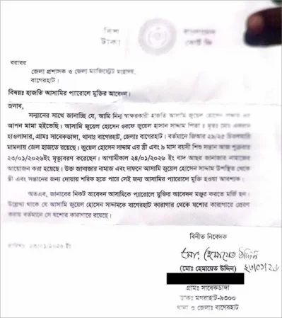 সাদ্দামের পরিবারের আবেদনটি যশোর জেলা প্রশাসকের কাছে নয়, বাগেরহাট জেলা প্রশাসক ও ম্যাজিস্ট্রেট বরাবর করা হয়েছে। অথচ নিয়ম অনুযায়ী, যে জেলা কারাগারে আসামি বন্দী থাকেন, প্যারোলে মুক্তির জন্য সেই জেলার জেলা প্রশাসক ও ম্যাজিস্ট্রেট বরাবর আবেদন করতে হয়।