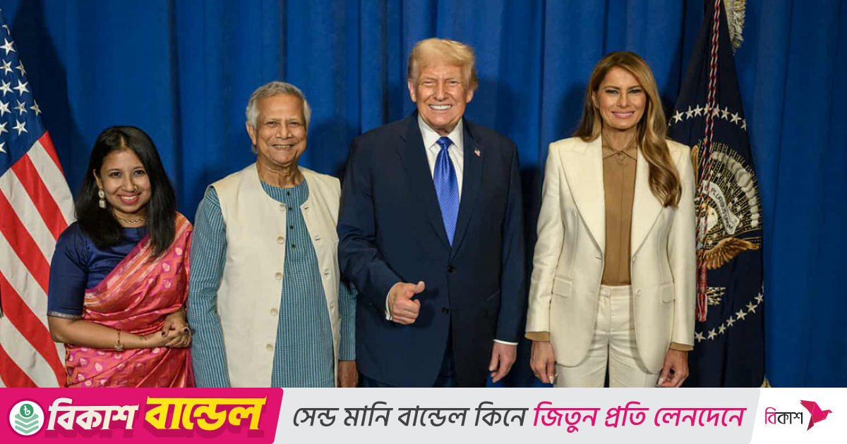 মার্কিন প্রেসিডেন্ট ডোনাল্ড ট্রাম্প এবং ফার্স্টলেডি মিলেনিয়া ট্রাম্পের সঙ্গে প্রধান উপদেষ্টা প্রফেসর মুহাম্মদ ইউনূস ও তার মেয়ে দিনা ইউনূসের ছবি প্রকাশ করেছে প্রধান উপদেষ্টার প্রেস উইং। গত ২৩ সেপ্টেম্বর লোটে নিউইয়র্ক প্যালেসে ট্রাম্পের অভ্যর্থনা নৈশভোজে এই ছবি তোলা হয়।