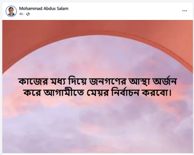 আব্দুস সালাম তার পোস্টে লেখেন, কাজের মধ্য দিয়ে জনগণের আস্থা অর্জন করে আগামীতে মেয়র নির্বাচন করব।