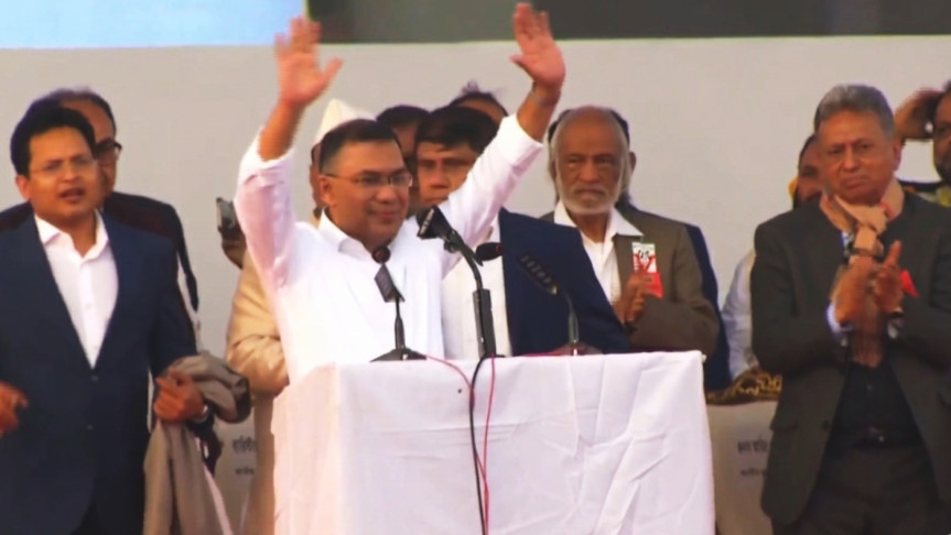 সকাল থেকেই রাজধানী ও আশপাশের জেলা থেকে আসা লাখো মানুষের উপস্থিতিতে ৩০০ ফিট এলাকা এক জনসমুদ্রে পরিণত হয়। স্লোগানে স্লোগানে মুখরিত হয়ে ওঠে পুরো এলাকা। মঞ্চে ওঠার পর তারেক রহমান হাত নেড়ে জনতাকে অভিবাদন জানান।