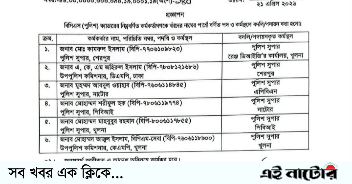 নাটোরের পুলিশ সুপার (এসপি) মোহাম্মদ আবদুল ওয়াহাব সহ ৬ বিসিএস পুলিশ কর্মকর্তা বদলি হয়েছেন।