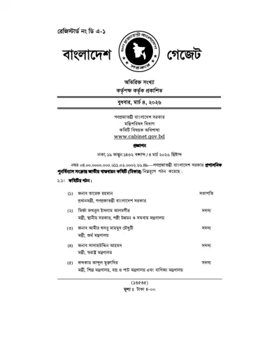 দেশের প্রশাসনিক কাঠামোকে আরও শক্তিশালী ও যুগোপযোগী করতে ‘প্রশাসনিক পুনর্বিন্যাস সংক্রান্ত জাতীয় বাস্তবায়ন কমিটি’ (নিকার) গঠন করা হয়েছে। প্রধানমন্ত্রী তারেক রহমানকে সভাপতি করে গঠিত এই উচ্চক্ষমতাসম্পন্ন কমিটি গঠনের বিষয়টি আজ বৃহস্পতিবার (৫ মার্চ) মন্ত্রিপরিষদ বিভাগ থেকে এক প্রজ্ঞাপনের মাধ্যমে নিশ্চিত করা হয়েছে। সরকারের এই পদক্ষেপের ফলে প্রশাসনিক বিকেন্দ্রীকরণ এবং জনসেবা প্রসারের ক্ষেত্রে নতুন দিগন্ত উন্মোচিত হবে বলে ধারণা করা হচ্ছে।