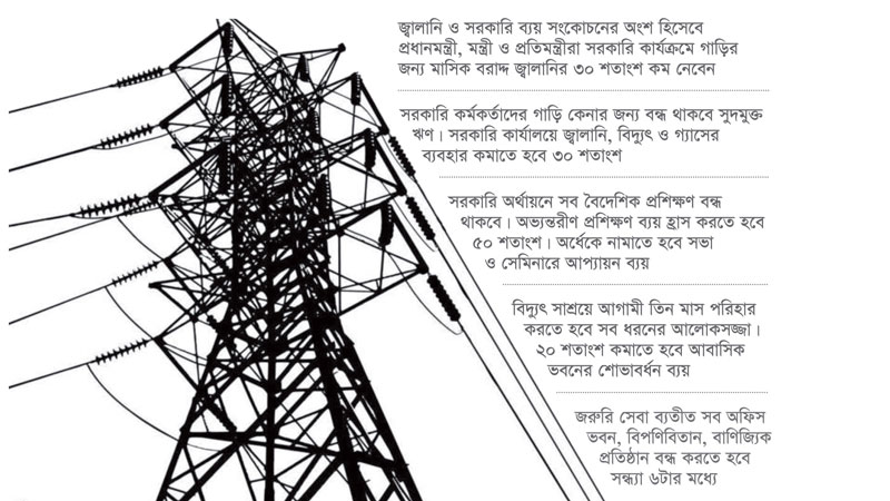 মন্ত্রিসভার সিদ্ধান্তের বিষয়ে সরকারি তথ্য বিবরণীতে বলা হয়, ভ্রমণ ব্যয় ৩০ শতাংশ, সরকারি খাতে গাড়ি, জলযান, আকাশযান ও কম্পিউটার কেনা শতভাগ বন্ধ এবং সরকারি গাড়িতে মাসিক ভিত্তিতে বরাদ্দ করা জ্বালানির ব্যবহার ৩০ শতাংশ কমাতে হবে। সরকারি কার্যালয়ে জ্বালানি, বিদ্যুৎ ও গ্যাসের ব্যবহার ৩০ শতাংশ কমাতে হবে। এছাড়া আবাসিক ভবন শোভাবর্ধন ব্যয় ২০ শতাংশ, অনাবাসিক ভবন শোভাবর্ধন ব্যয় ৫০ শতাংশ এবং ভূমি অধিগ্রহণ ব্যয় শতভাগ কমানোর বিষয়েও মন্ত্রিসভার বৈঠকে সিদ্ধান্ত হয় বলে তথ্য বিবরণীতে জানানো হয়েছে।