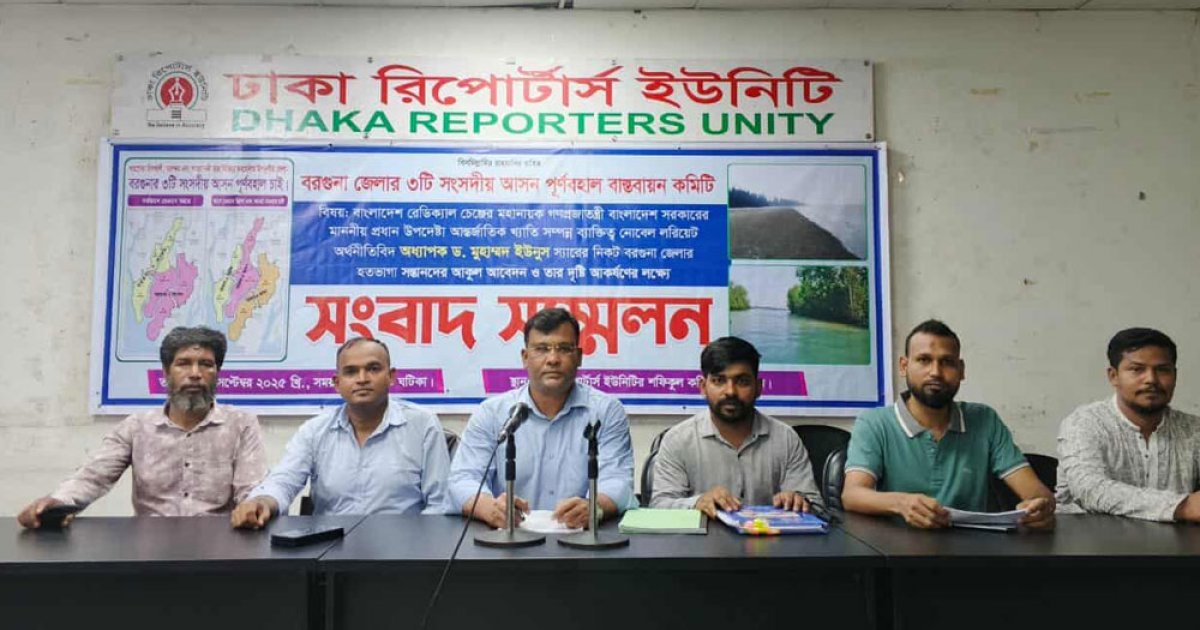 বরগুনা জেলায় তিন আসন পুনর্বহালের দাবি জানিয়েছেন জেলার বিভিন্ন রাজনৈতিক দলের নেতৃবৃন্দ। আজ শনিবার ঢাকা রিপোর্টার্স ইউনিটির শফিকুল কবির মিলনায়তনে বরগুনা জেলার ৩টি সংসদীয় আসন পুনর্বহাল বাস্তবায়ন কমিটি উদ্যোগে এক সংবাদ সম্মেলনে বক্তারা এই দাবি জানান।