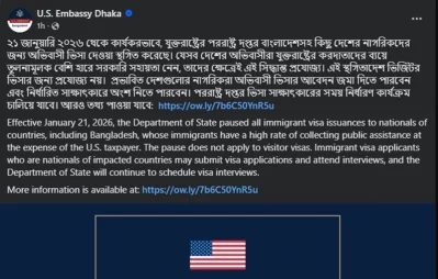 তবে যারা বেড়াতে যাওয়ার পরিকল্পনা করছেন, তাদের জন্য সুখবর রয়েছে। মার্কিন দূতাবাস স্পষ্ট করেছে যে, এই স্থগিতাদেশ শুধুমাত্র অভিবাসী ভিসার ক্ষেত্রে প্রযোজ্য। সাধারণ ভিজিটর ভিসা বা পর্যটন ভিসার ক্ষেত্রে এই সিদ্ধান্তের কোনো প্রভাব পড়বে না। অর্থাৎ, যারা ভ্রমণ বা স্বল্প সময়ের জন্য যুক্তরাষ্ট্রে যেতে চান, তারা আগের মতোই নিয়মিত ভিসা সুবিধা পাবেন।