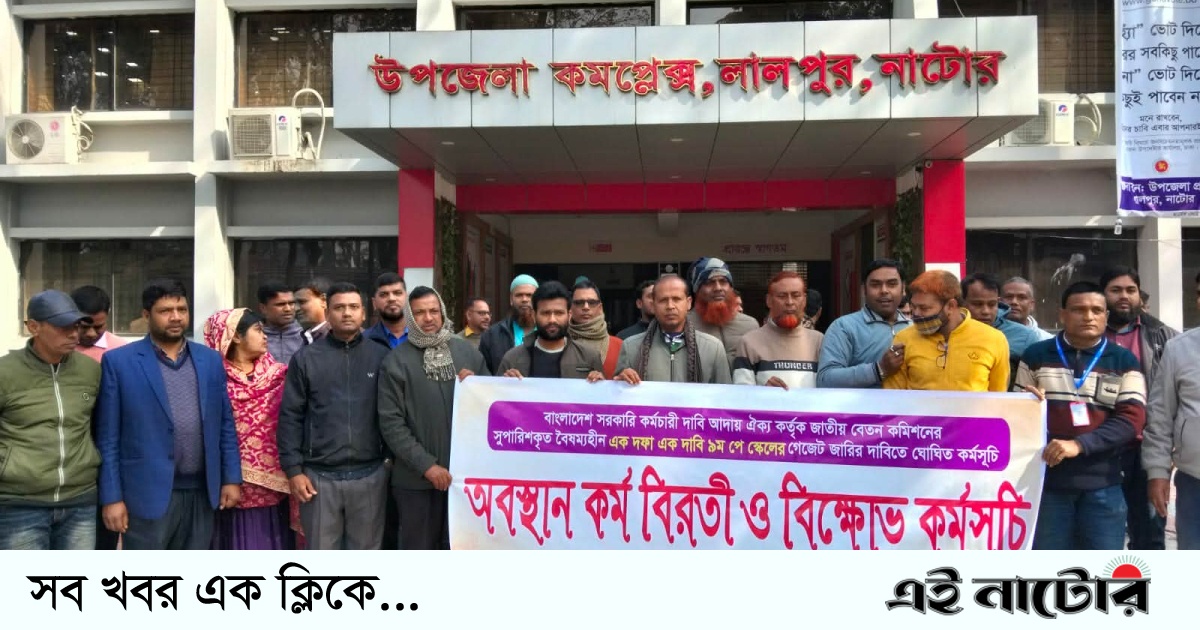 নাটোরের লালপুর উপজেলার ১০-২০ তম গ্রেডের কর্মকর্তা ও কর্মচারীগনরা নবম পে স্কেল বাস্তবায়নের দাবিতে কর্ম বিরতি দিয়ে শান্তিপূর্ন ভাবে মানববন্ধন ও বিক্ষোভ কর্মসুচি পালন করেছেন তারা।