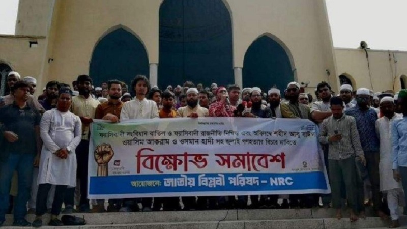 গতকাল শুক্রবার বাদ জুমা জাতীয় মসজিদ বায়তুল মোকাররমের উত্তর গেটে অনুষ্ঠিত এক বিক্ষোভ সমাবেশে সভাপতির বক্তব্যে তিনি এ দাবি জানান। সামগ্রিক পরিস্থিতিতে জুলাই গণহত্যার বিচার ও সংসদে আইন পাস করে ফ্যাসিবাদী রাজনীতি নিষিদ্ধ করার বিষয়ে চুপ করে থাকার অবকাশ নাই বলে মন্তব্য করেন সংগঠনটির আহ্বায়ক খোমেনী ইহসান। তিনি বলেন, বিচার আদায় করতে হলে আমাদেরকে লাগাতার আন্দোলনের মধ্যে থাকতে হবে। ছয় মাসের মধ্যে যেন বিচার ও শাস্তি কার্যকর হয় এজন্য দুই মাসের মধ্যে জেলায় জেলায় ট্রাইব্যুনাল খোলা ও সকল অভিযুক্ত খুনিকে গ্রেপ্তার করার বিষয়ে জনগণকে রাজপথে হাজির করা হবে। ফ্যাসিবাদী দল ও সংগঠনের দলগত বিচারের দাবি আদায়েও রাজপথে প্রতিরোধ ও সংসদ ঘেরাও করা হবে।
