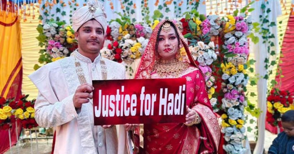 বিয়ের মঞ্চে বর-কনের ‘হাদি হত্যার বিচার’ দাবি